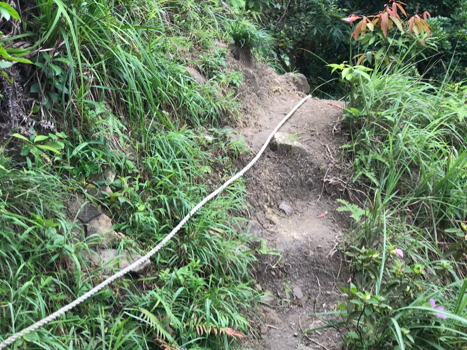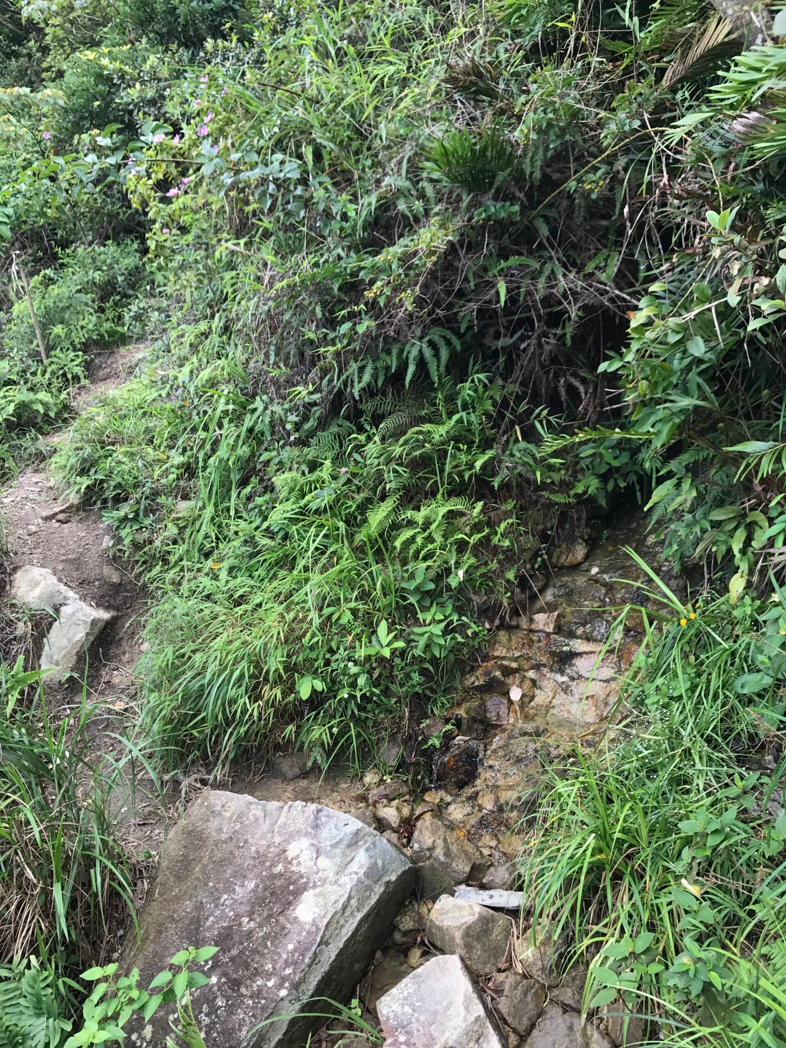 It is an unmarked trail, very steep and thus could pose issues if you have fear of heights. There are some tricky passages and when it rains, rocks and mud become slippery (I know, I have been up there in the rain). Hence my second advice, definitely get shoes with a good grip and a hiking pole. This being said, the last time I climbed, I saw an old guy going down with flip flops! On the other hand, rigid hiking boots do a disservice on such terrain: you need flexibility to nestle your feet in the nooks of the terrain. In this respect, you may want to read my post about my barefoot hike on suicide cliff.