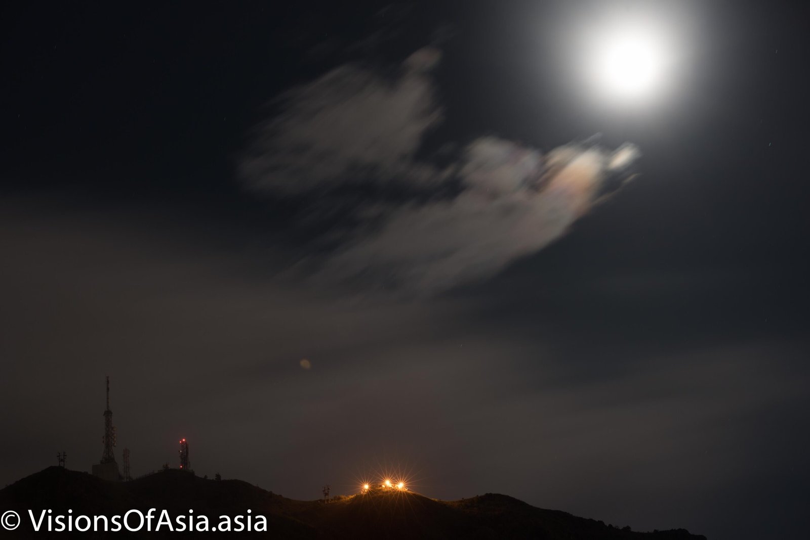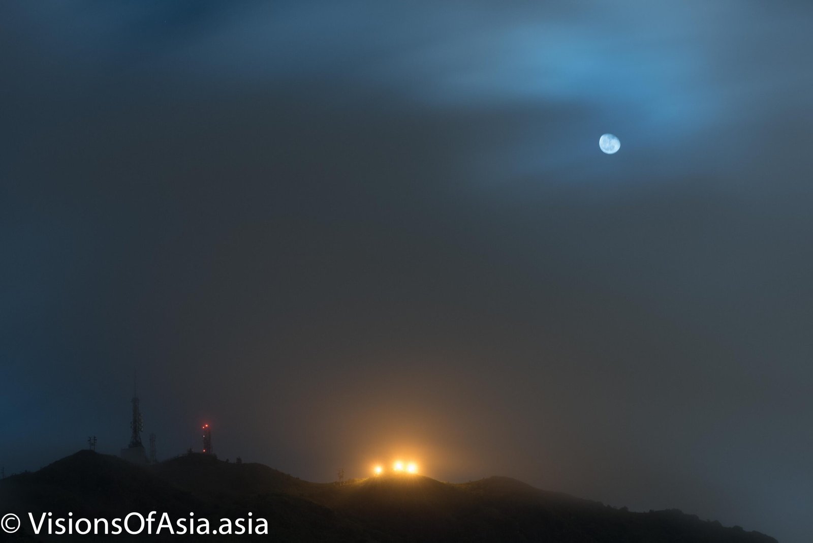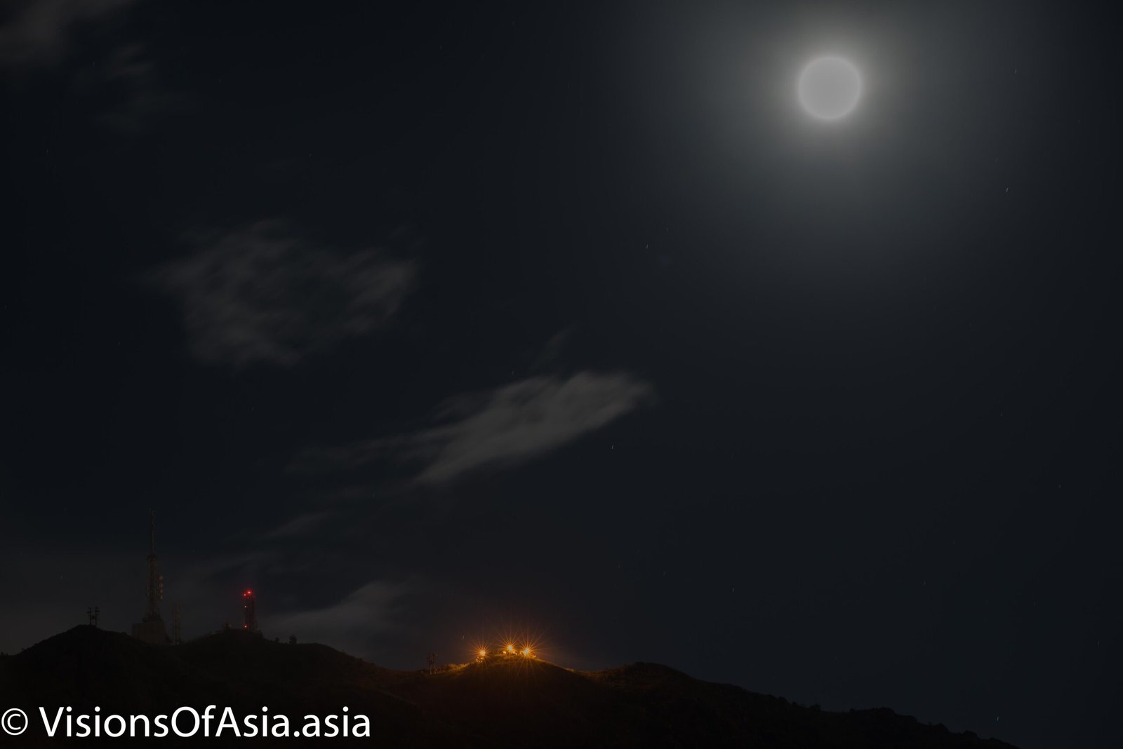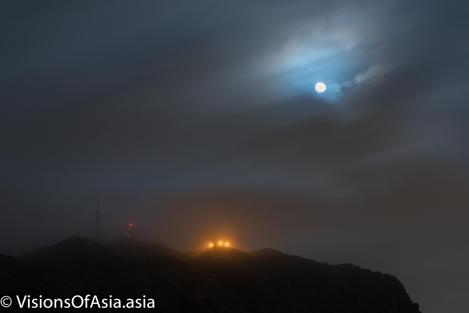 I posted a few weeks ago a picture of a moon crescent over Kowloon Peak. Yesterday night, the stars were aligned again, this time with the full moon.