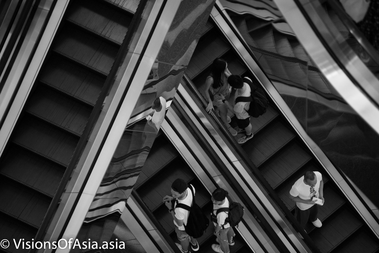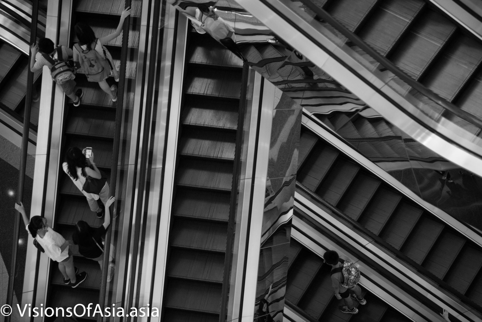 The main ingredient was the place, which is the Festival Walk mall, in Kowloon Tong. The mall has the particularity of having an intricate set of escalators which are equipped with mirrors, hence providing a very interesting visual effect when photographed from above.