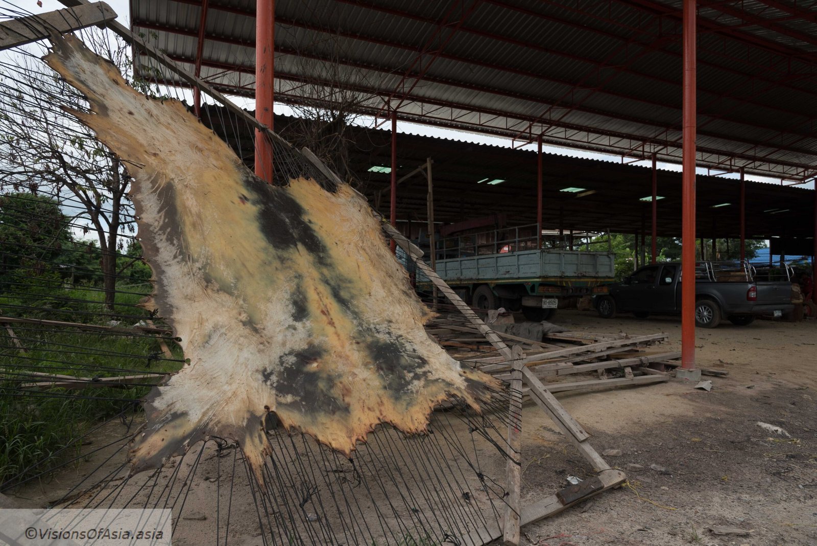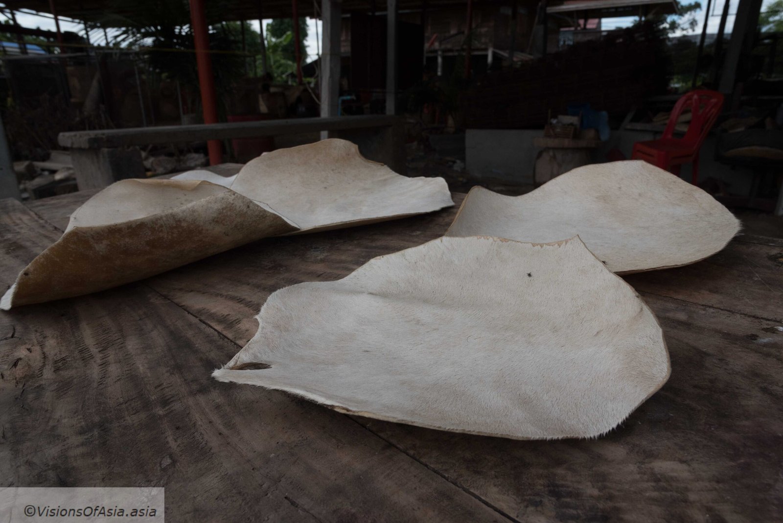 It all starts with the hide. A large cow hide is stretched on a portico, to let it dry as well as to extend it to its maximum size. If you are lucky, you will see such a hide hung outside to dry.