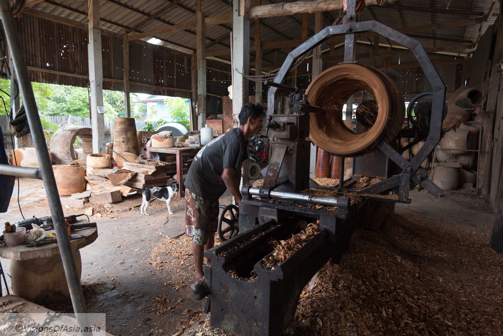 While the hide for covering the drum is stretched and extended, the wooden body of the drum is prepared. For the bigger size drums, they use the whole trunk of a tree, which is then hollowed in a single piece on a machine as you can see in this picture.