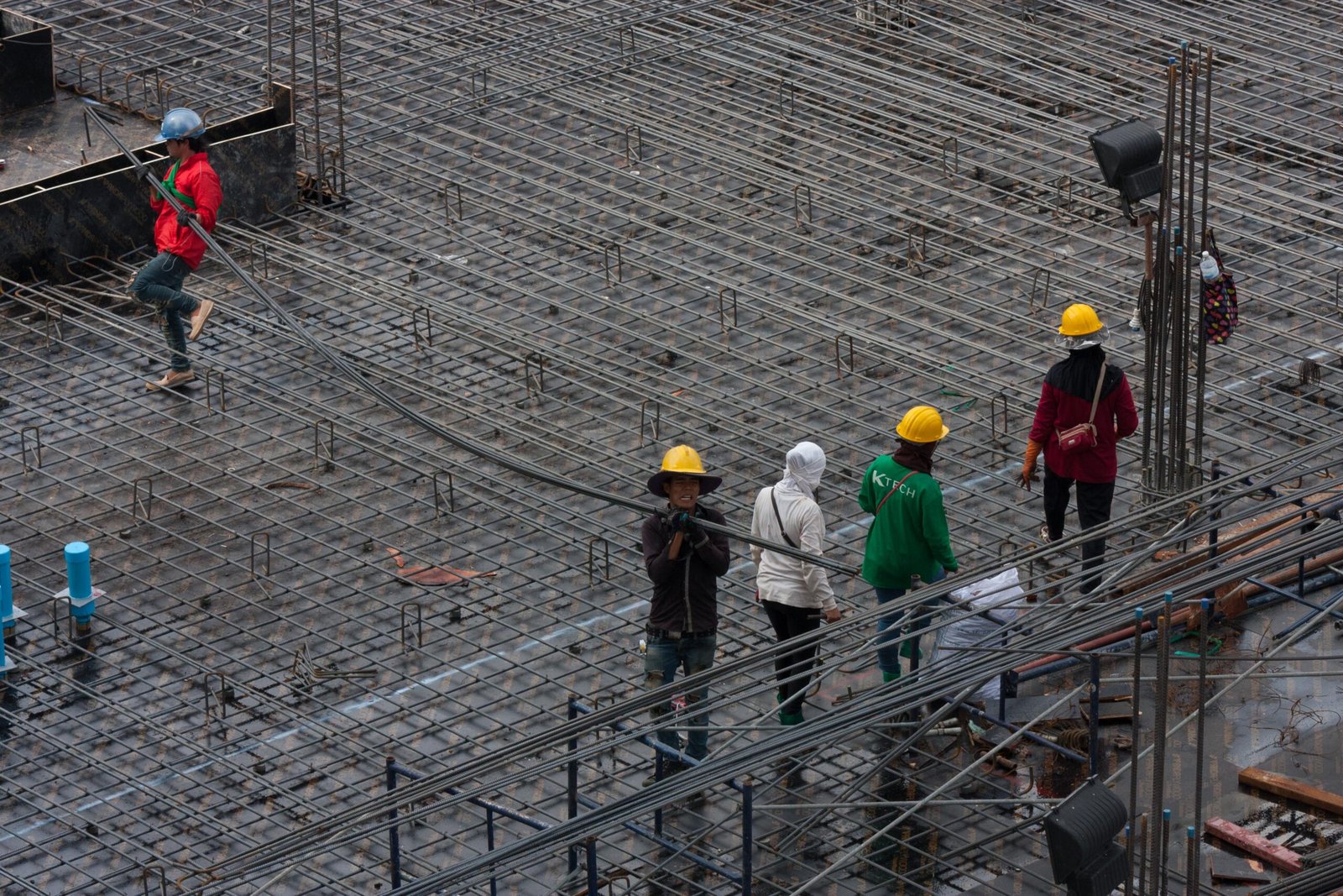 In some cases, a worker can be holding a metal rod with his flip-flops while another worker hammers it into place…