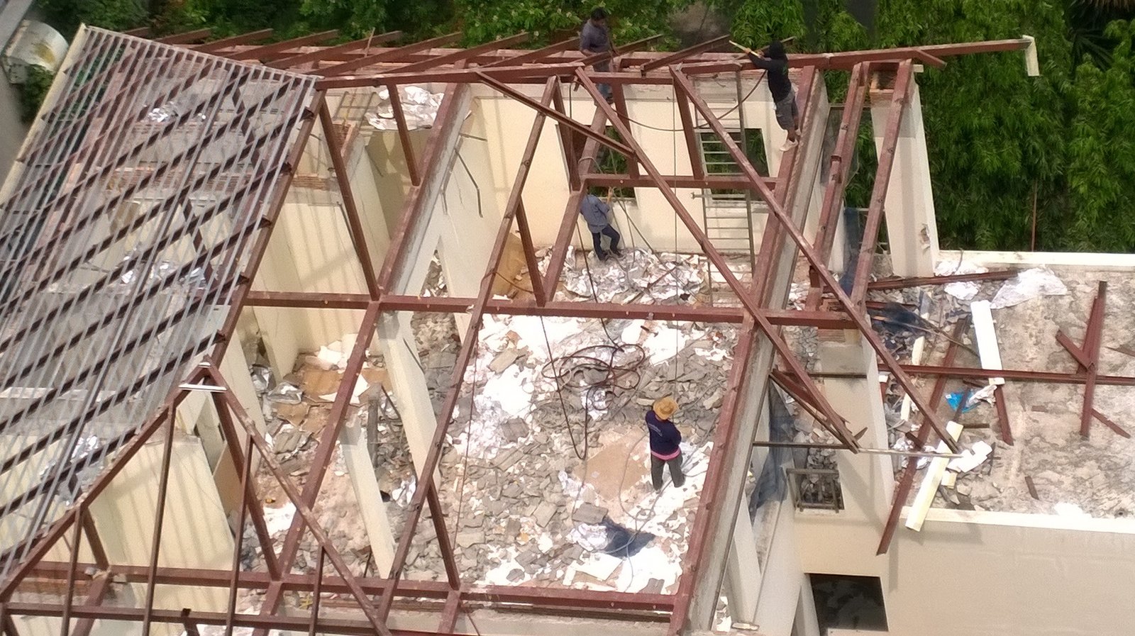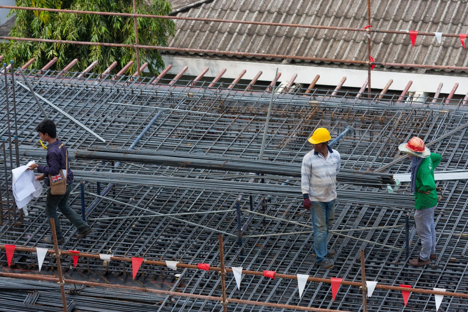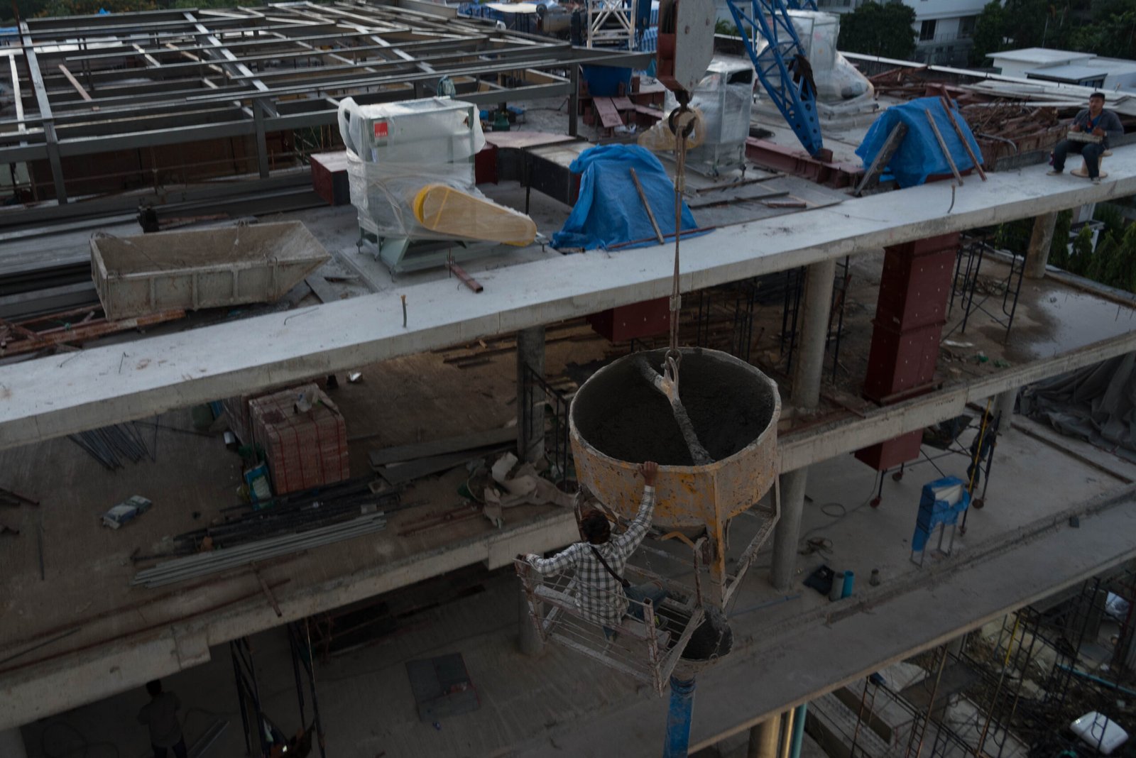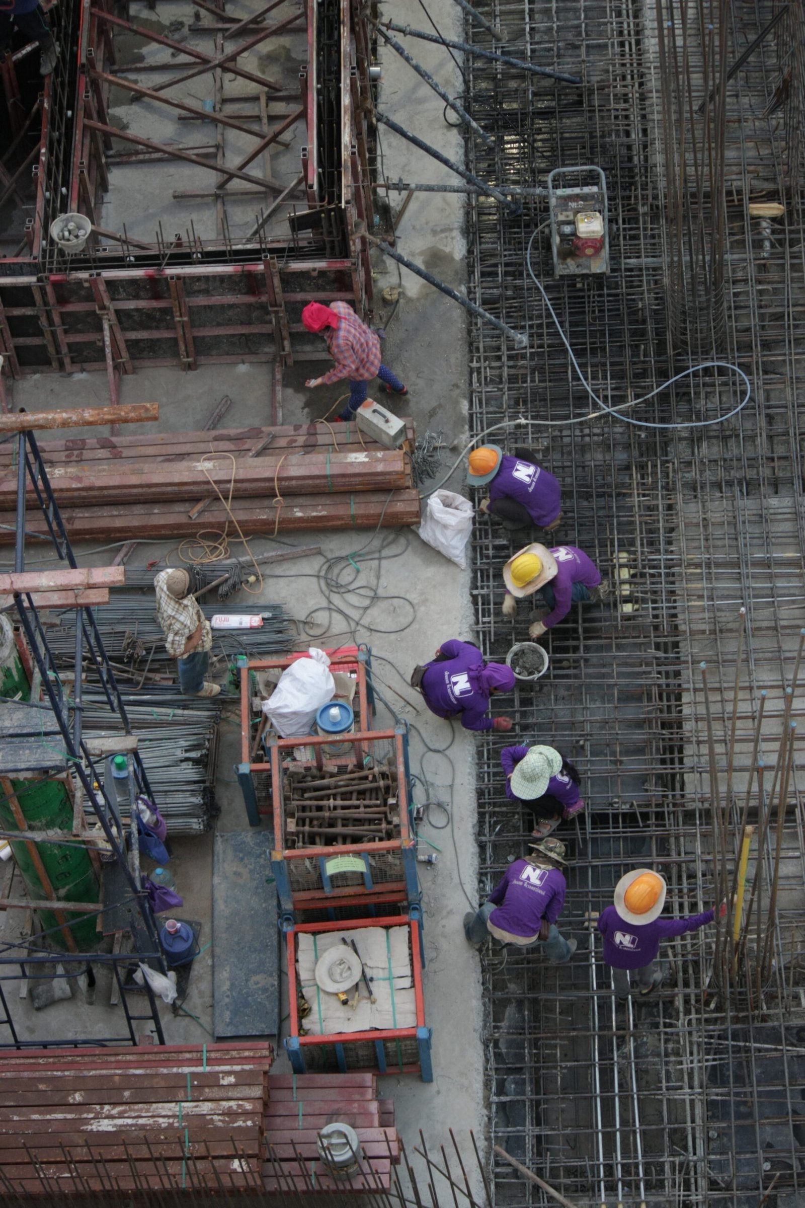 Thanks to the breakneck pace and the extended hours (7 AM to 10 PM), the construction site moved very quickly, and as can be seen in this picture, where three different floors are being built simultaneously. Sometimes, this breakneck pace ends tragically, when structural issues cause a collapse of the construction.