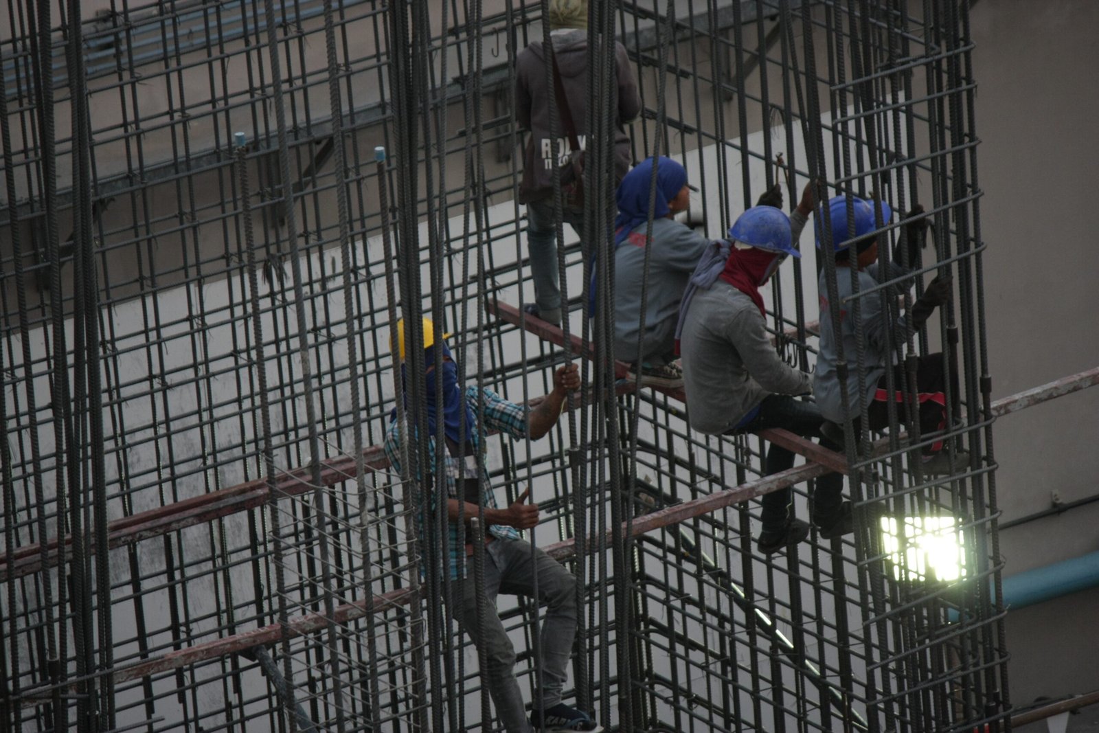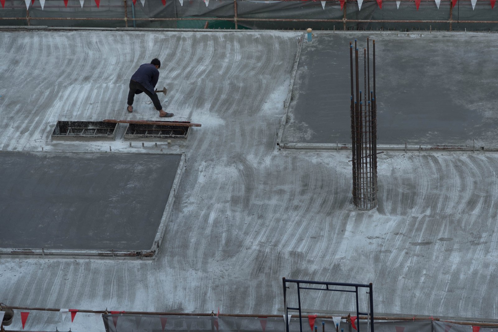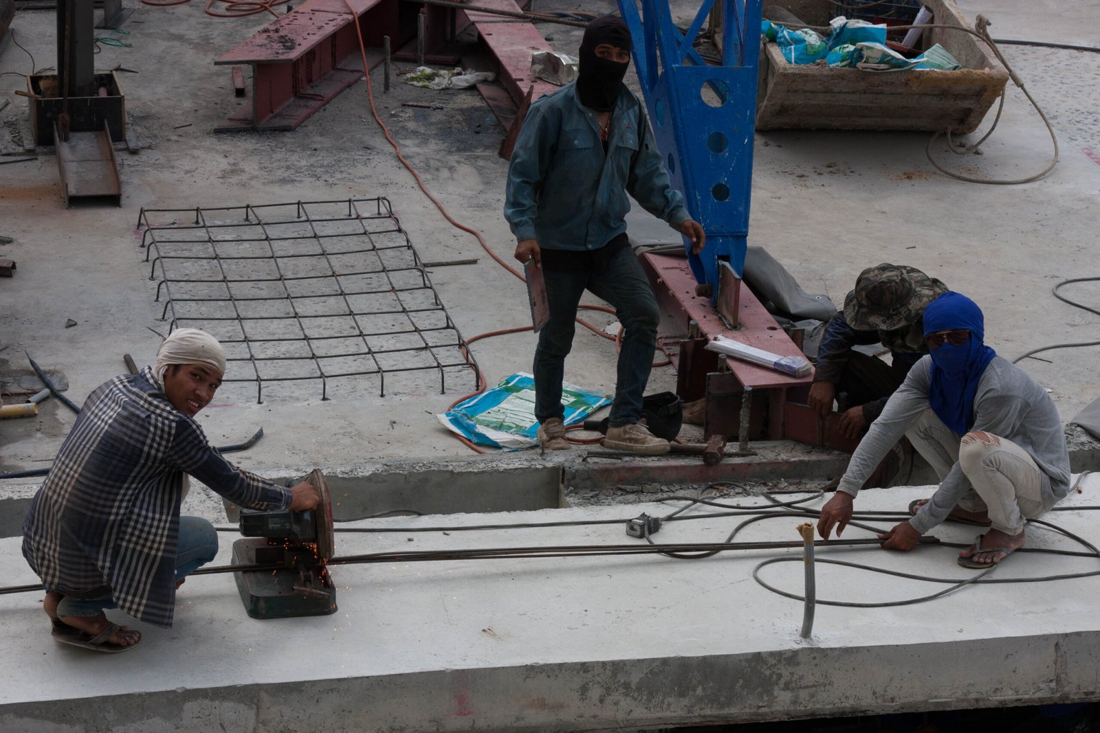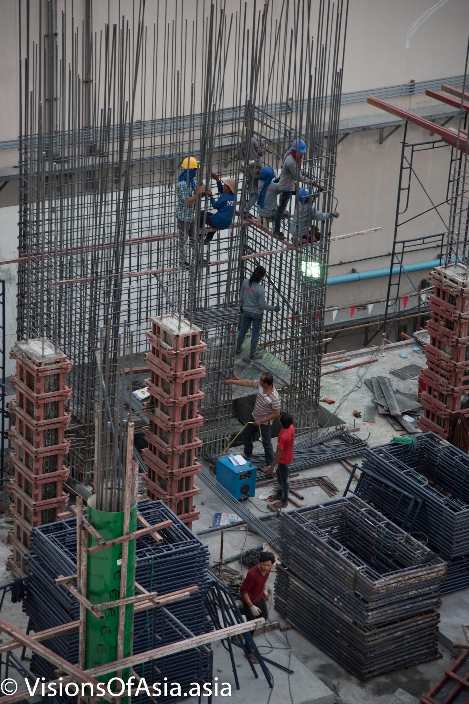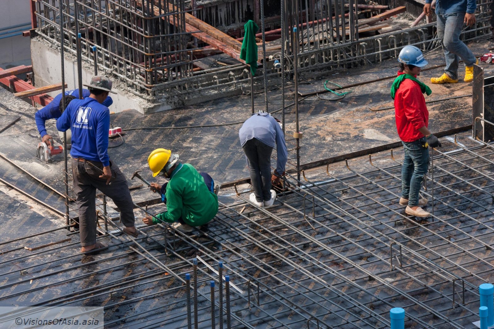The building process involves laying layers of reinforced concrete, building support columns with more reinforced concrete, then building another floor above, often all at the same time. A fascinating work but done with a happy-go-lucky stance and total disregard for safety. As in this picture, you can see how many workers wear a helmet…