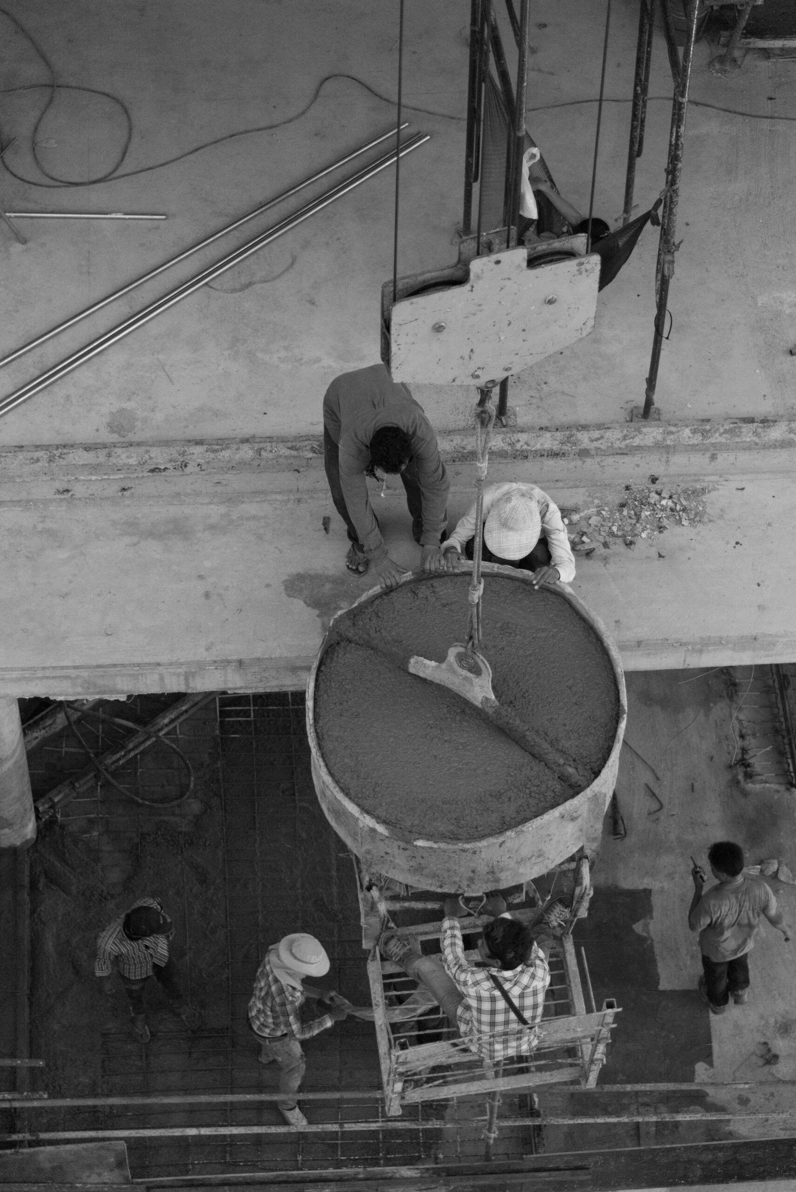 Towards the end of the building, the main crane was dismounted in favor of a small roof-mounted crane. In order to pour cement, the crane carried a worker who had to action the lever allowing the cement to flow.