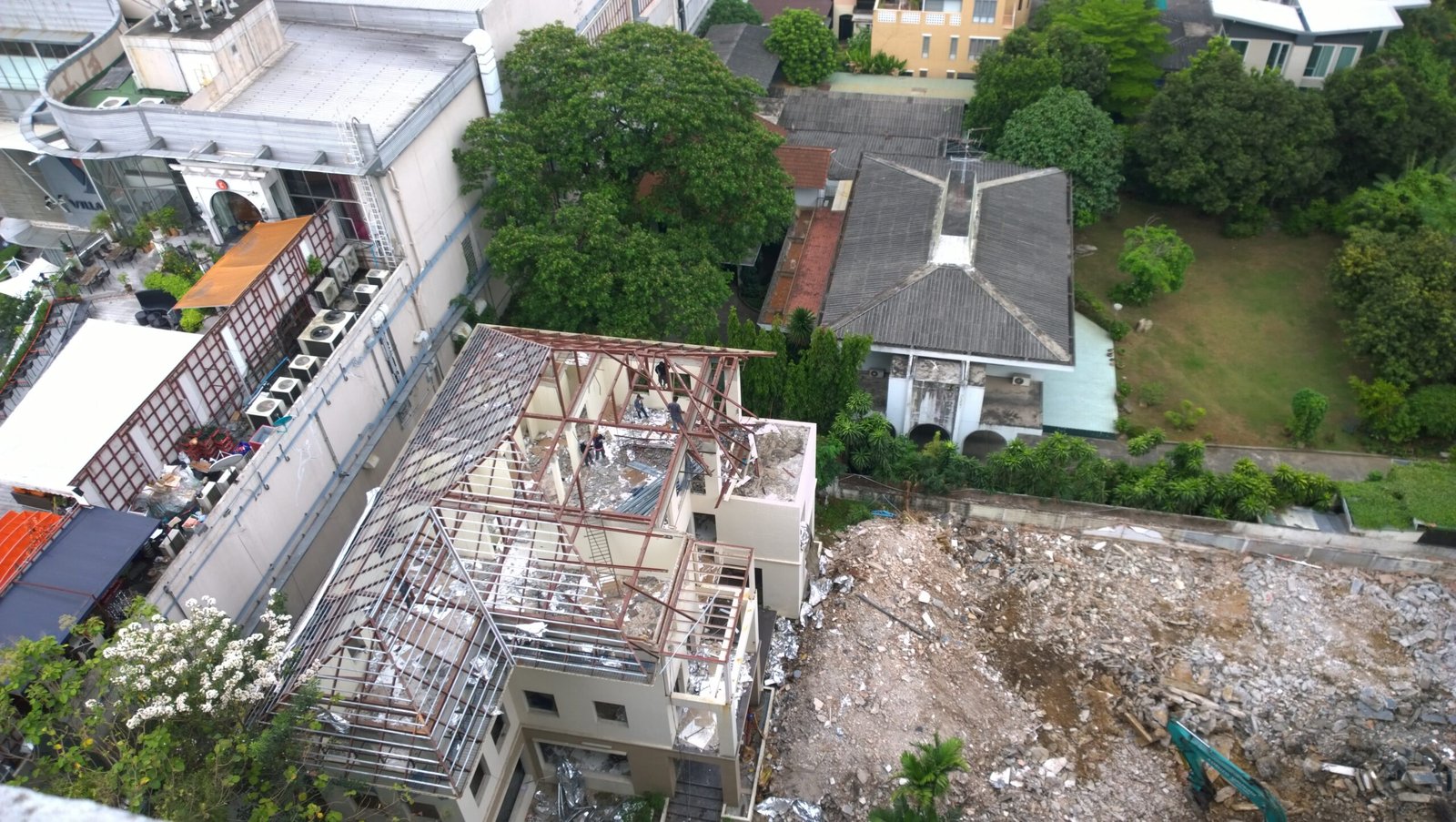 In Bangkok, in prime locations, new projects often start with destroying old buildings. The construction site of the Commons was no exception, as they destroyed an old restaurant that occupied two stories in the back of the land. Probably an inefficient use of space for such valuable land.