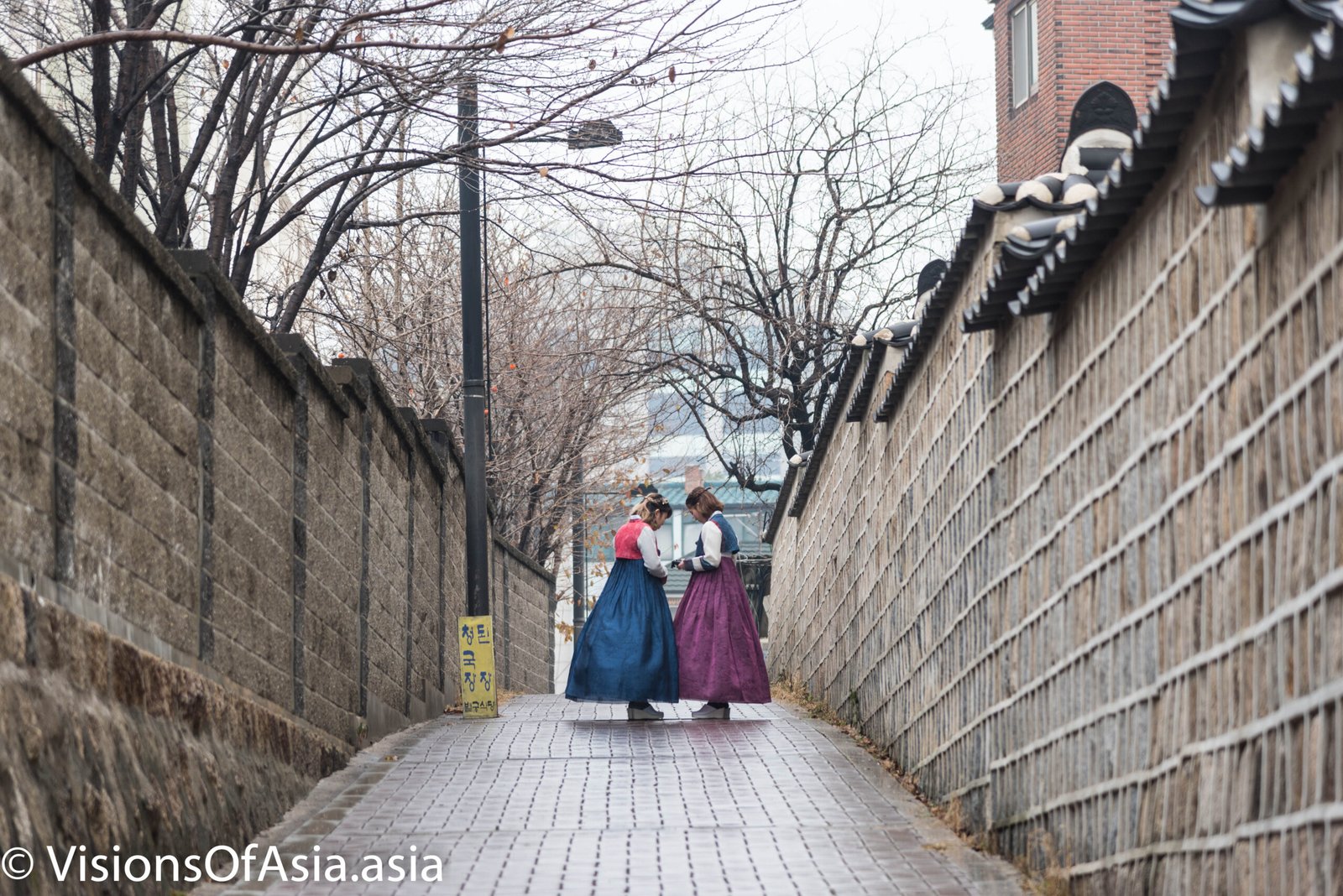 When visiting the area Bukchon Hanok and Gyeongbok are easily combined. Most people start their tour through Gyeongbok as it is on the main Saejong-Daero avenue. My choice was rather to start walking through Bukchon Hanok, then moving to Gyeongbok. It is a lovely transition, especially if you go there in the morning. Indeed, I was fortunate enough to capture girls in Hanbok and relatively empty streets. It is difficult to give instructions on how to get there, but there is no train station or bus stop within Bukchon Hanok, so it will always involve a short walk to get there.