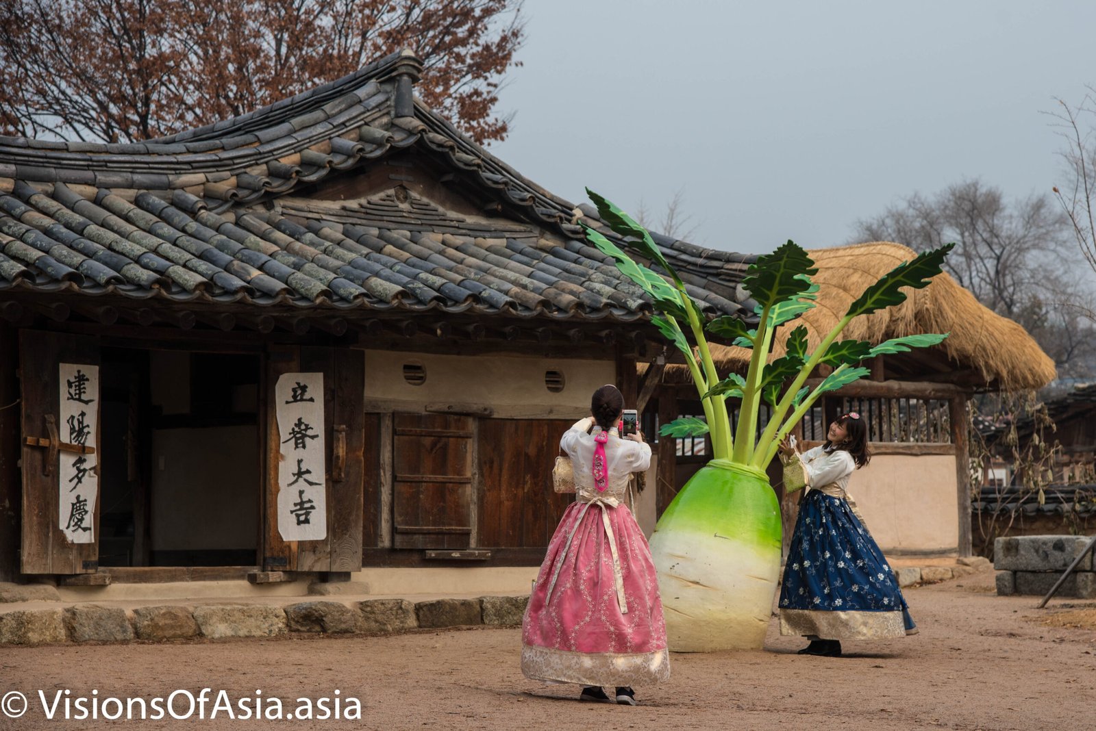 With its quiet areas and lovely settings, Bukchon Hanok is an ideal place for intemporal pictures. Some details betray the girls trying to play the game, though, like the shoes… Or posing next to a very modern plastic radish!